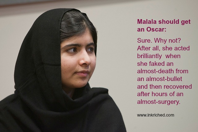 Admit it. You`re jealous. Don`t be shy. You know you want the limelight. All those years of watching Hollywood movies about the CIA and spies, this fetish has taken its toll on that limited brain of yours. All those years of posing in front of the mirror trying to smile like Tom Cruise, or pout like Angelina Jolie must amount to something, right? You can`t see straight, so you now live your fantasy through Malala. You can come out of that closet of yours now. I hear there is a rehab for people suffering from `why-does-Malala-get-to-have-all-the-fun`. You’ll ace it!
